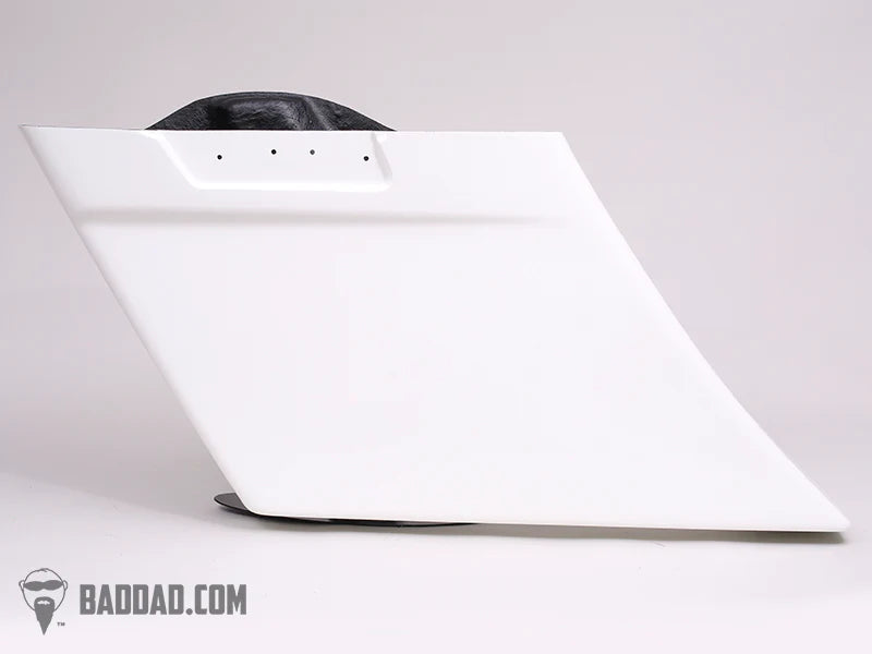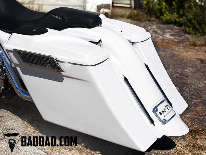 Competition Series Stretched Bags: Bad Dad's Competition Series Stretched Saddlebags are stretched 4-1/2" down & 7" back for a great custom look that is still very rideable and extremely functional. The Competition Bags are each pre-drilled and pre-fit to make this a simple bolt-on replacement for your original bags. You will reuse your stock saddlebag lids and hardware. All of Bad Dad's Stretched Bags are finished in final primer which is ready to go directly to paint.