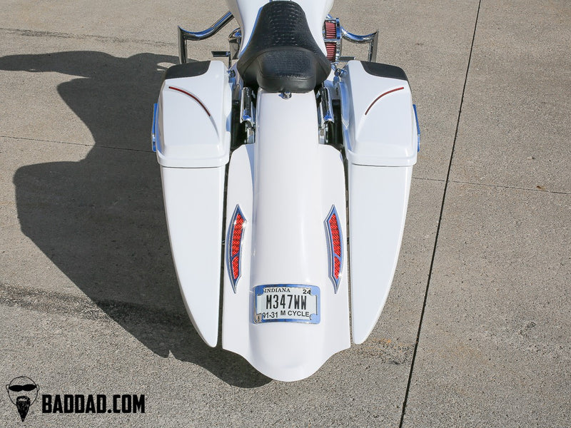Rear Fender: Bad Dad's Street Series Rear Fender is a complete bolt-on replacement fender which installs in place of your original fender. The Street Series Fender installs between the bike's frame rails and is compatible with your detachable docking hardware, including your backrest, sissy bar, and luggage rack. All of Bad Dad's rear fenders are pre-drilled & pre-fit to make this a simple bolt-on part directly out of the box. See notes below regarding Tour Pack options.