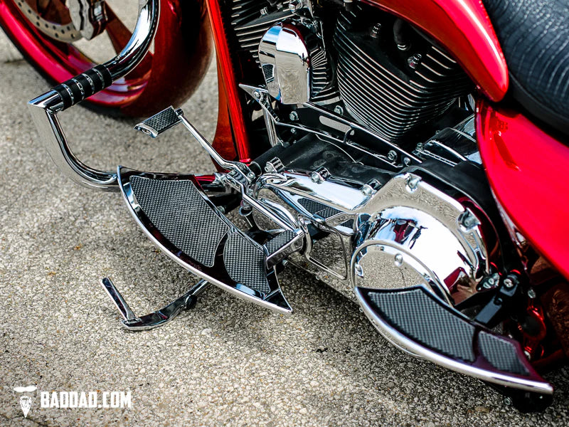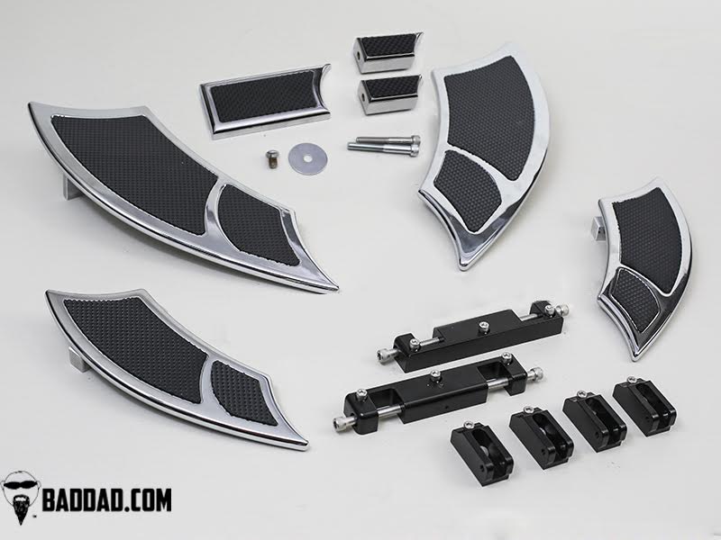 Dramatically improve the look of your custom bagger with Bad Dad's 966 Floorboards and save a few dollars when buying the complete kit. This complete kit includes Driver Floorboards, Passenger Foot Pegs, Brake Pedal, and your choice of Single or Dual Shift Pegs. All mounting hardware is included with this complete package.
